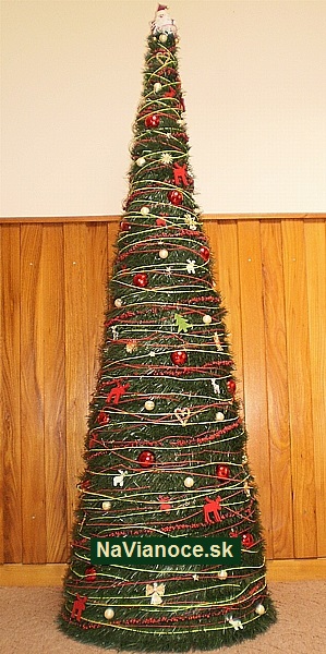 ♣ Vianočné stromčeky sú dodávané zložené, tak ako je vyobrazené na obrázku. ♣ Vianočné ozdoby a vianočné osvetlenie sa uchytáva tak ako na klasický vianočný stromček, napr. na klasické háčiky. ♣ Stromčeky sú vyrobené z trvácnych materiálov a vydržia niekoľko rokov. ♣ Korpus je železná konštrukcia zosilnená pletivom, na ktorom je umelá smreková čečina. ♣ Vyrobené na Slovensku. ♣ Pre náhľad klikni na obrázok.